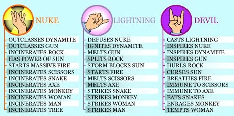 No longer are you stuck with just rock, paper, or scissors, now there are 25 hand gestures to choose from to prove that your idea is the greatest. For instance, lightning melts scissors, devil inspires dynamite, and nuke incinerates monkey – fascinating. Click the link above to see how they all interact. Good luck figuring it out, I can't make dynamite or snakes out of it.