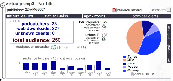Also, Master Penn emailed me a snap of the stats today. I was shocked to see it, but – there, plain as day, without question, was, that’s right: a pie chart. I was stunned! Oh, wait, there are numbers, too. Seriously, “total number 250, unique IP 185.” And while I have no idea what that means, my guess it is that more people than the following have listened to my unique tale. I’m flattered. Also, I got an email today from a PRSA associate, not just a member, someone who actually works for PRSA saying “p.s. The ‘murder mystery’ — very cool!”